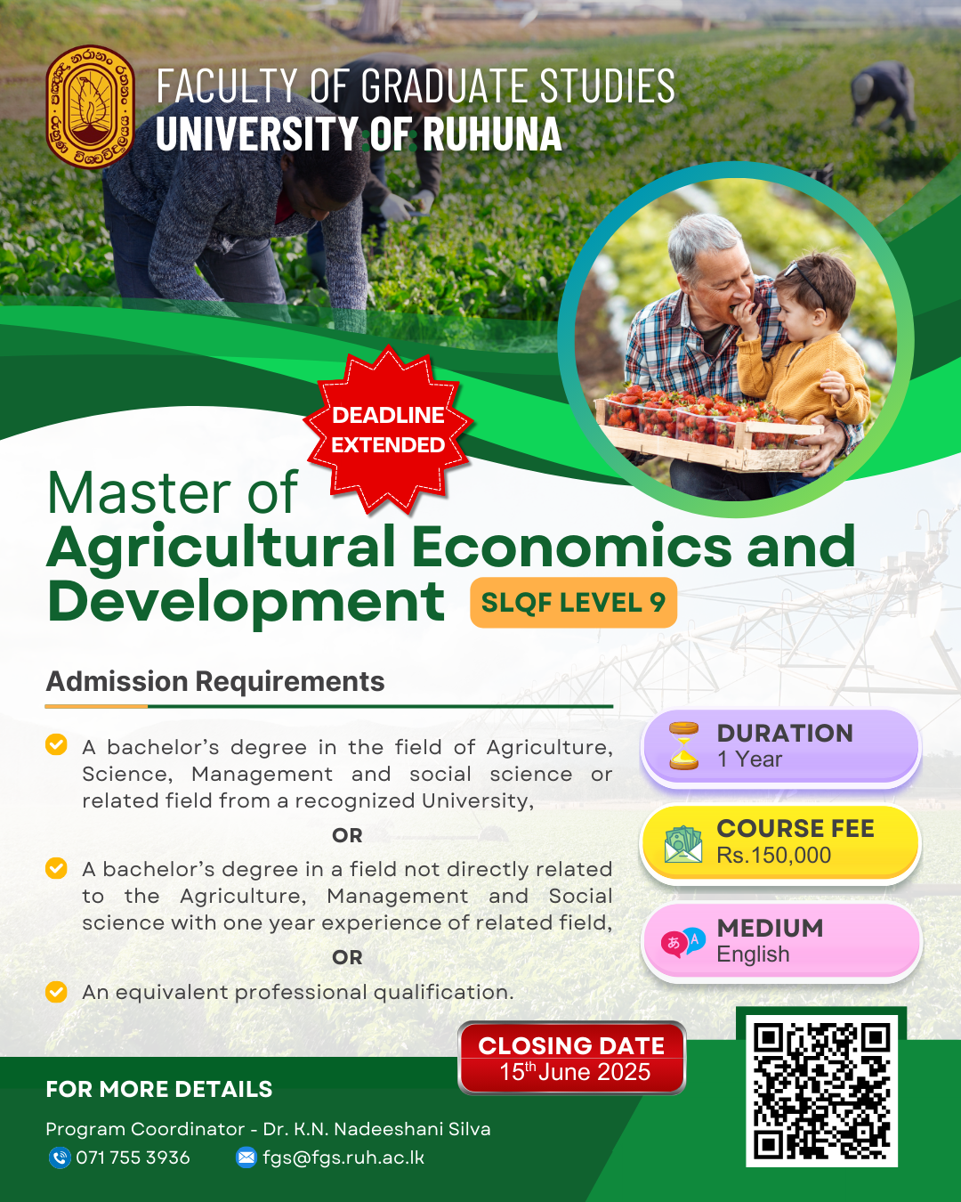 More details about the programme can be obtained from the Department of Agricultural Economics (MAED: Dr. K.N.Nadeeshani Silva - 0717553936; MABM: Dr. M.A.P.D.P. Wickramarathna - 0718336908; MSc.AgERM: Dr. D.N. Koralagama - 0718350897), Faculty of Agriculture, University of Ruhuna