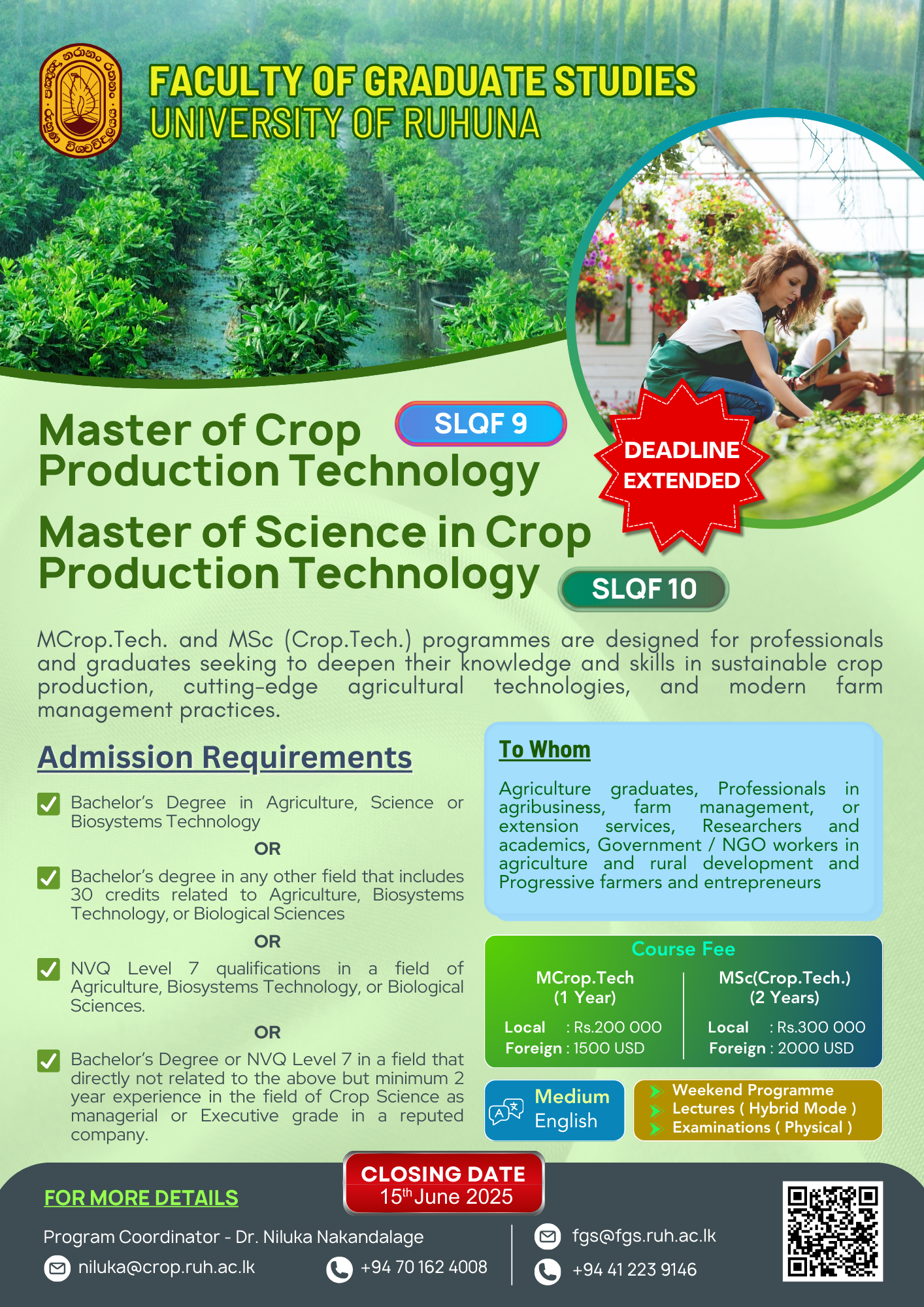 The Faculty of Graduate Studies, University of Ruhuna, has announced an extension for the submission of applications for the Master of Crop Production Technology / Master of Science in Crop Production Technology degree programs. Prospective candidates are encouraged to complete and submit their online applications on or before than 31st December 2024 via the following link: https://fgs.ruh.ac.lk/application/.