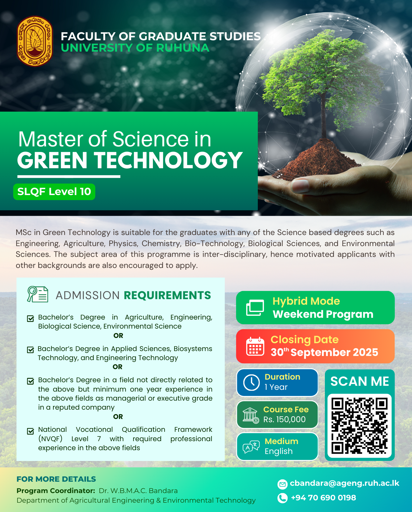 Faculty of Graduate studies, University of Ruhuna calls applications from eligible candidates for the Post Graduate Degree Program, Master of Science (MSc) in Green Technology conducted by the Faculty of Graduate Studies in collaboration with the Department of Agricultural Engineering