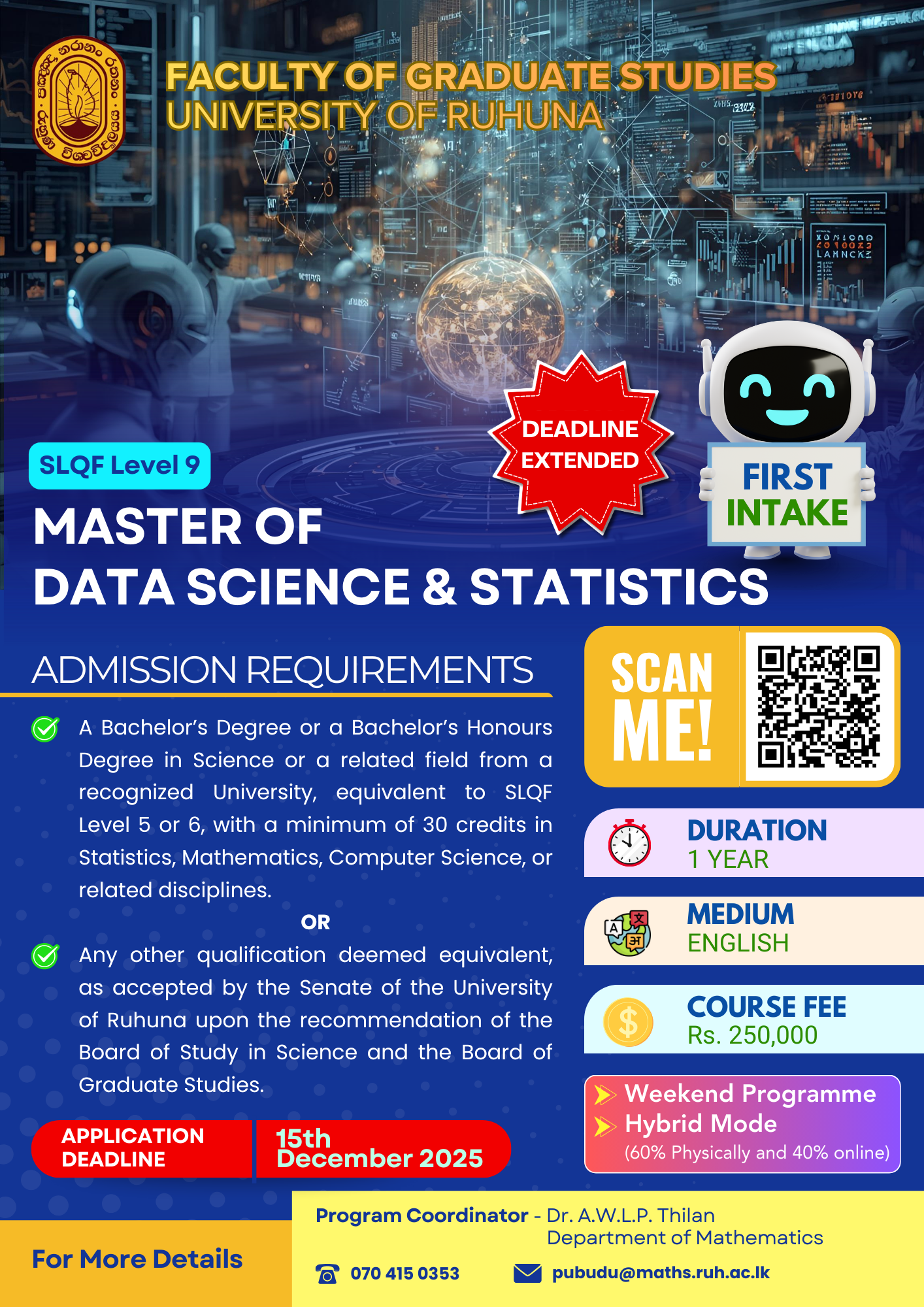 The Master of Science in Data Science and Statistics is designed to equip students with advanced statistical, computational, and analytical skills required to extract meaningful insights from complex data.