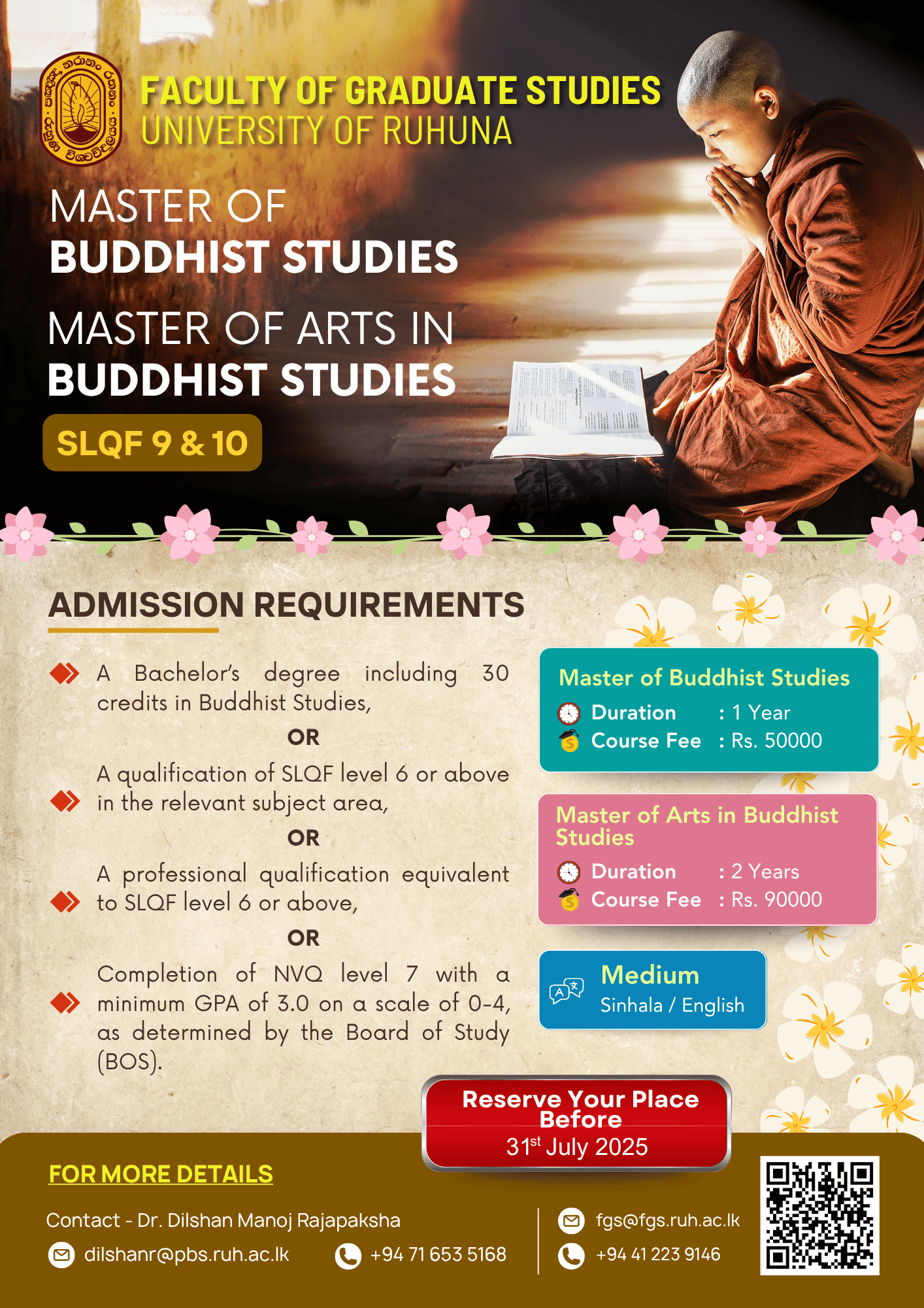 Following a comprehensive survey conducted by the Department of Pāli and Buddhist Studies, Faculty of Humanities and Social Sciences, University of Ruhuna, the program has been developed to address the acknowledged requirements and subject areas that students seek to study in the field of Pāli and Buddhist Studies. All activities from the registration of Postgraduate Examiners for the above course to the awarding of the relevant degree will be conducted in accordance with the relevant regulations by the Department of Pāli and Buddhist Studies, University of Ruhuna. These are advanced degrees designed to help students strengthen their subject knowledge and skills related to Buddhist theories, practices, and research methodologies beyond the undergraduate level.