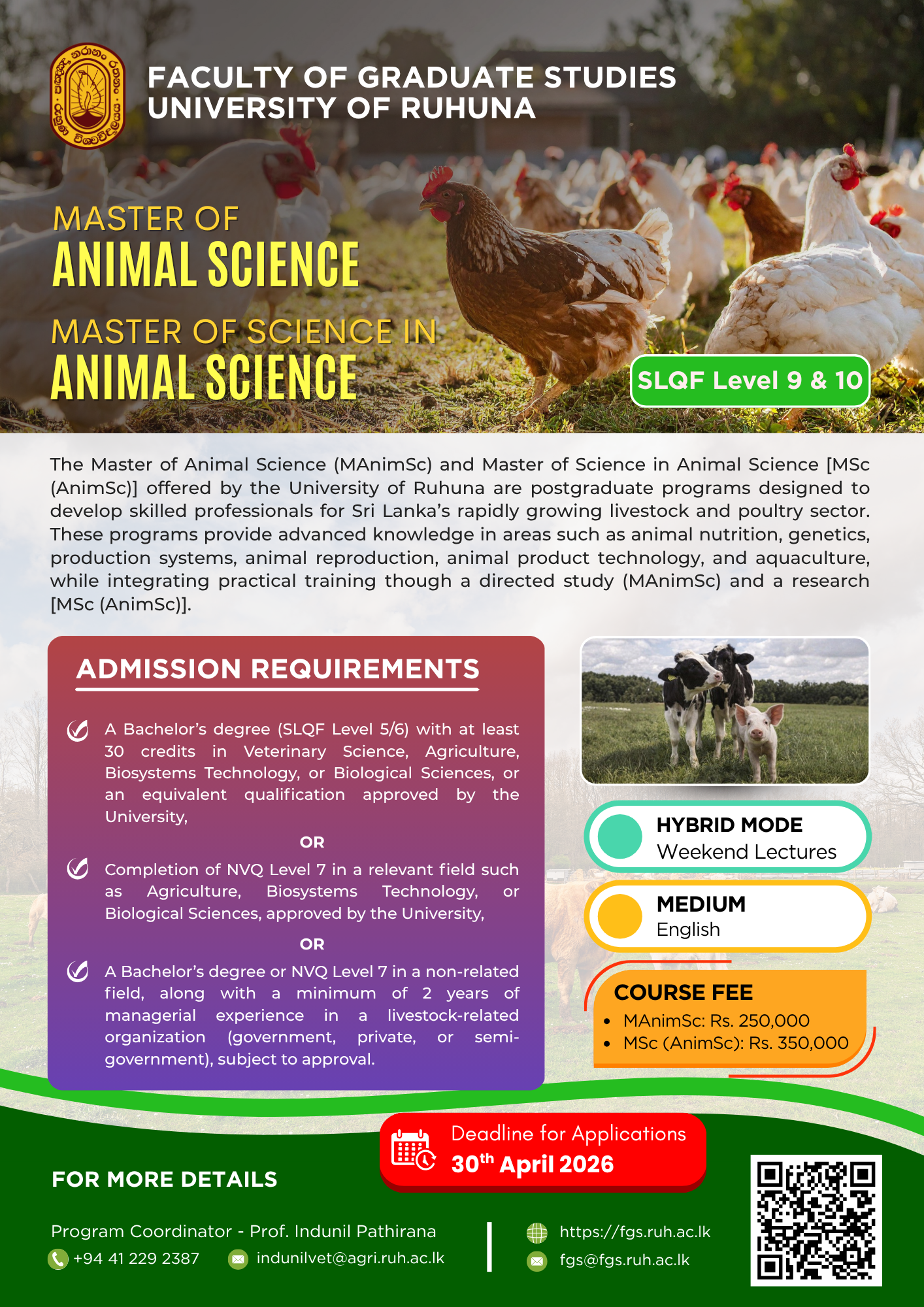 The Master of Animal Science (MAnimSc) and Master of Science in Animal Science [MSc (AnimSc)] programmes are designed to address the growing demand for skilled professionals in the rapidly expanding livestock and poultry sector in Sri Lanka. These programmes aim to equip graduates with advanced scientific knowledge, technical expertise, and problem-solving abilities to support industries such as dairy, poultry, and aquaculture, while contributing to national economic development.